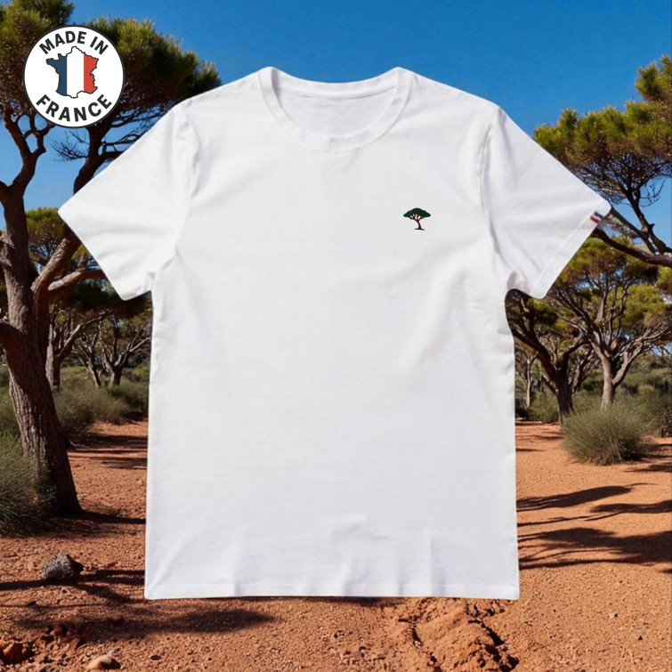 Tee-shirt bio, origine France garantie. Coupe cintrée. Col rond. Brodé avec un pin parasol sur le devant. Drapeau tricolore sur la manche. Taille normalement.